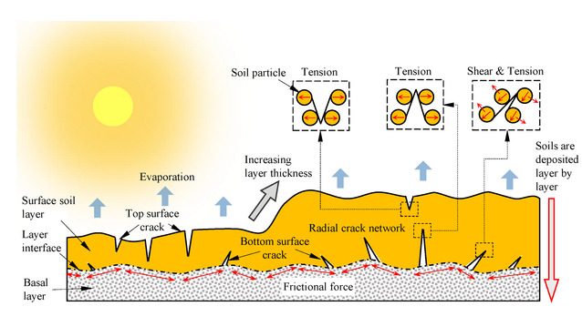 土体干缩开裂是一种常见的自然现象。伴随着开裂过程,除了土体内部的孔径分布以及孔隙水的渗流路径发生变化以外,土体的水-力性能(例如:保水能力,承载能力)也会被弱化,从而直接或间接诱发一系列工程地质灾害或者环境地质问题,如滑坡、泥石流、土壤荒漠化等。受全球气候变化的影响,未来干旱气候的发生频率和影响范围有增加趋势,土体的干缩开裂问题可能越发严重。深入掌握裂隙的发育过程及现象背后的机理,对提升工程地质界应对气候变化的能力和指导干旱地区的工程地质防灾减灾具有重要意义。