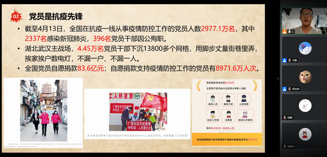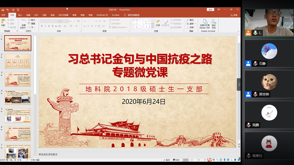 为深入贯彻落实《关于开展基层党组织常态化疫情防控“四个一”行动的工作通知》具体要求,充分发挥党支部战斗堡垒作用和全体党员先锋模范作用,让党旗始终高高飘扬在疫情防控、返校复学、事业发展全过程全方位,2020年6月24日,pg电子官网2018级硕士生一支部举行了一次线上主题党日活动。党支部书记李全坤做了以“习总书记金句与中国抗疫之路”为题的专题微党课。随后的组织生活会以“迎党的生日、讲战疫故事、悟初心使命”为主要内容展开,支部党员积极发言,结合战疫说身边故事,讲切身体会。