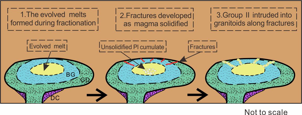 结合岩相学、地球化学变化趋势以及数值模拟计算(Rhyolite-MELTS和REE瑞利分馏模拟)的研究,研究团队认为加查淡色花岗岩的源岩为年轻下地壳的石榴角闪岩,并可能混有约20%来自古老基底的变沉积岩组分。这些源区岩石经历了含水部分熔融,其熔融出来的花岗质母岩浆发生了高度结晶分异作用产生了淡色花岗岩的熔体,而第二组淡色花岗岩还叠加了最高30%斜长石堆晶作用的影响。据此,研究团队提出一个成岩模型来合理解释这些地质和地球化学现象:深部地壳含水部分熔融形成的母岩浆在就位之后随着结晶分异作用的进行,产生了演化的花岗质熔体组分;这些组分又经历钠质斜长石的堆晶,在主体岩浆固化的晚期,由于构造应力,斜长石堆晶体与间隙熔体沿岩浆结晶产生的裂缝侵入至固化的主体花岗岩中,最终形成第二组淡色花岗岩;而主体花岗岩中局部分异出来的淡色熔体最终形成了第一组淡色花岗岩(图1)。冈底斯淡色花岗岩与其南侧喜马拉雅淡色花岗岩的巨大岩石地球化学差异性表明,这两种花岗岩虽然产出位置十分接近,但是由于源岩成分、熔融反应以及后期岩浆演化的差异最终导致它们的地球化学特征差异明显。