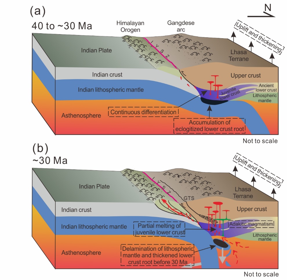最后,研究团队结合冈底斯岩浆岩带中渐–中新世高Sr/Y花岗岩类的大量集中出现,认为在这一时期冈底斯地区的新生下地壳大规模熔融可能与岩石圈地幔拆沉有关(图2),这也是大陆地壳由初生的玄武质向长英质演化的重要机制之一。