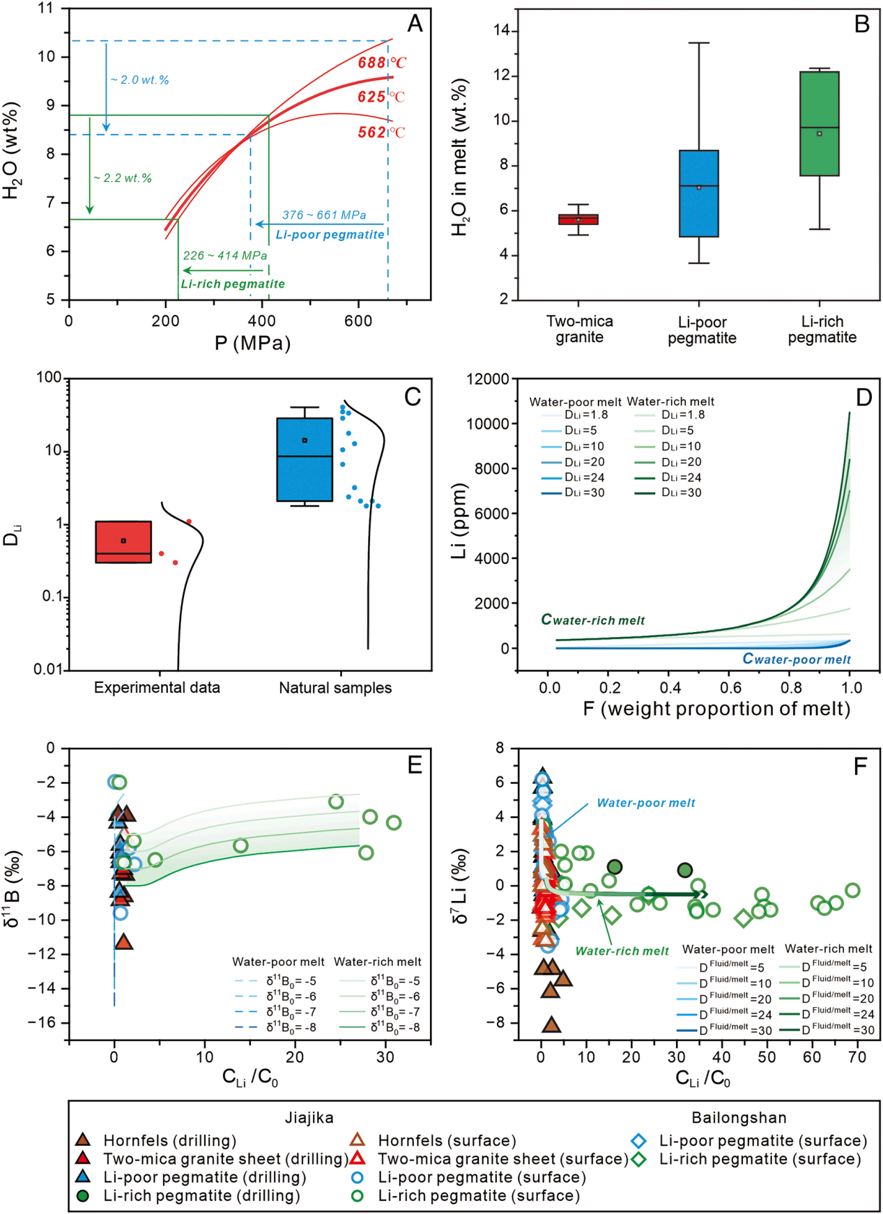 根据甲基卡锂矿区花岗岩的矿物组合,本研究采用质量平衡模型模拟全岩地球化学数据变化,证实了在分离结晶过程残余熔体中锂等稀有金属的逐步富集。然而,地球化学模拟显示,当结晶度达到岩石流变学的熔体抽离阈值(~75%),残余熔体中锂含量(1500-2150 ppm)仍远低于锂辉石结晶所需的饱和度阈值(>5000 ppm)。因而单一岩浆结晶分异作用不能形成甲基卡富锂伟晶岩。