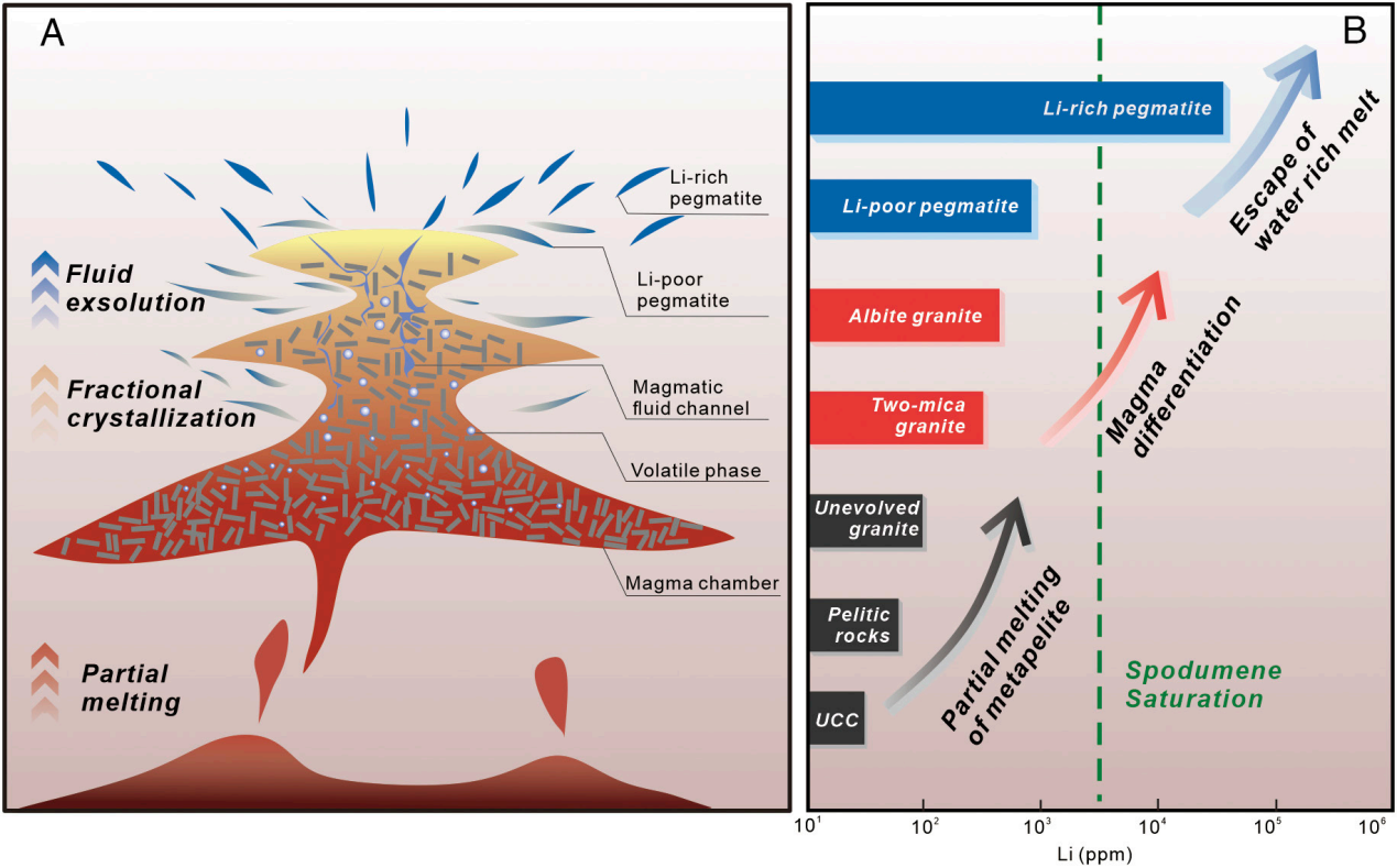 关于锂-铯-钽型(LCT型)伟晶岩的成因,学界长期存在"深熔派"与"结晶分异派"之争:一方认为其源于变质沉积岩的低程度部分熔融,另一方主张其为花岗质岩浆极端分离结晶的残余产物。然而,全球伟晶岩矿区普遍存在"富矿-贫矿"并存现象,单一成因模型难以解释为何仅少数伟晶岩能实现锂辉石过饱和并结晶成矿。松潘-甘孜造山带延伸约2800公里,沿线分布有甲基卡、可尔因、扎乌隆、白龙山等十余处大型-超大型伟晶岩型锂矿床,构成我国规模最大的稀有金属成矿带—“松潘-甘孜锂矿链”。面对国家资源战略与找矿突破的新要求,亟待解决松潘-甘孜成矿带地质背景与成矿驱动力、成矿物质来源、成矿潜力、控矿因素等科学问题。