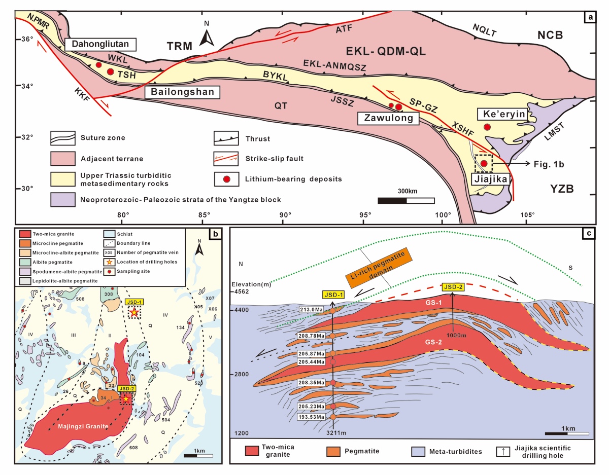 图1. (a) 青藏高原北部松潘—甘孜地体的构造简图; (b)甲基卡伟晶岩锂矿区地质图;(c)甲基卡锂矿区深部多层穹状花岗岩席(GS-1和GS-2)和侵入变质沉积岩(T3)的伟晶岩脉群(Pg)组成的多层三明治结构。