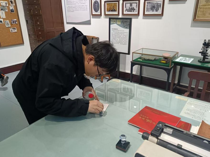 博物馆参观完毕后,大家在研究所工作人员的引导下参观了南古所的科研仪器设备以及真实的研究员工作间,了解了同位素分析的步骤和作用以及电子显微镜的成像机理和强大功能,并和一线的科研人员展开实地交流讨论,切身体会到了古生物科研工作的魅力。接着在研究所图书馆报告厅中,同学们和多位入职南古所的杰出南大校友们进行了深入而有收获的面对面交谈,相关出席人员有张勇、李涛、李子波、杨生超、汪伟、王翰林等研究员。同学们高水平且结合学习实际的提问获得了研究员们的一致好评。最后,同学们参观了南古所的历史陈列馆以及李四光先生的办公旧址,并保留印章明信片留念。