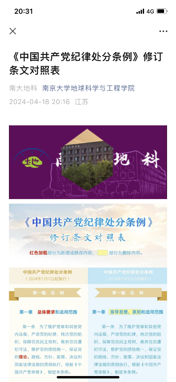 院党委及时发放了组织部为党员购买的《条例》,在学院微信公众号上转载刊发中央媒体、南大组工等有关解读文章,整理了地科院党纪学习教育材料汇编,营造学习氛围、做好学习保障。428日上午,地科院召开党委会,会议审核通过了《地科院党委关于开展党纪学习教育的实施方案》,接着举行理论学习中心组集体学习暨党纪学习教育读书班,通过领学、研学等方式,组织理论学习中心组成员在自学的基础上认真交流研讨。