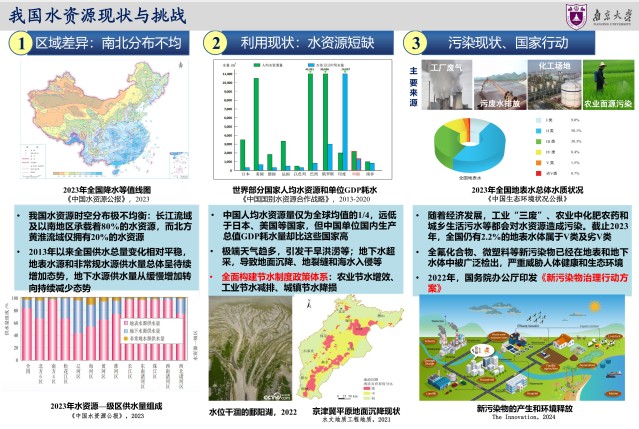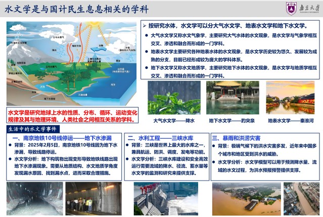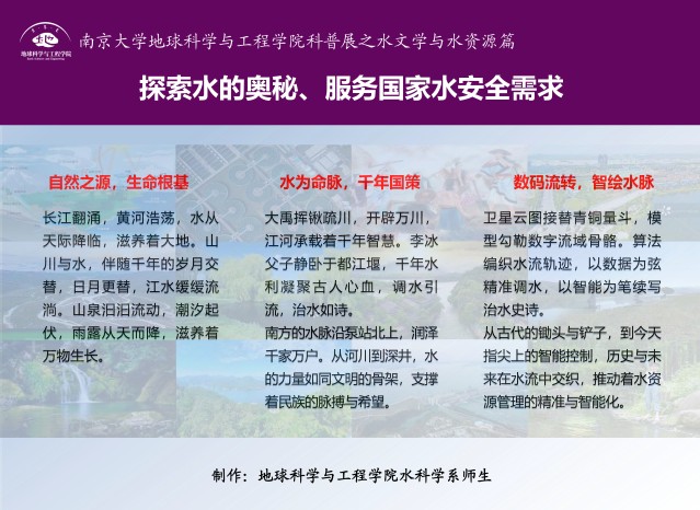 2025年3月22日是第三十三届“世界水日”,3月22日-28日是第三十八届“中国水周”。为深入学习贯彻习近平生态文明思想、习近平法治思想和习近平总书记关于治水重要论述精神,扎实推动水利高质量发展,保障国家水安全,南大地科院水科学系师生制作展出《探索水的奥秘、服务国家水安全需求》科普展板。水是生命之源,也是万妙之门。水文学是与国计民生息息相关的学科。国家对水资源的需求日益增长,水资源供需矛盾不断加剧,践行“节水优先、空间均衡、系统治理、两手发力”的治水思路,通过节水技术与管理实现水资源可持续使用。展览在鼓楼校区南园橱窗展出,欢迎大家前往观看,与我们一起探索水的奥秘。