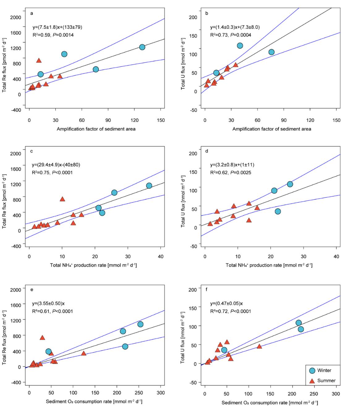 图1.陆架沉积物Re和U通量与沉积物浸灌作用系数(a, b)、有机碳厌氧分解速率(c、d)和沉积物耗氧速率(e , f)的相关性