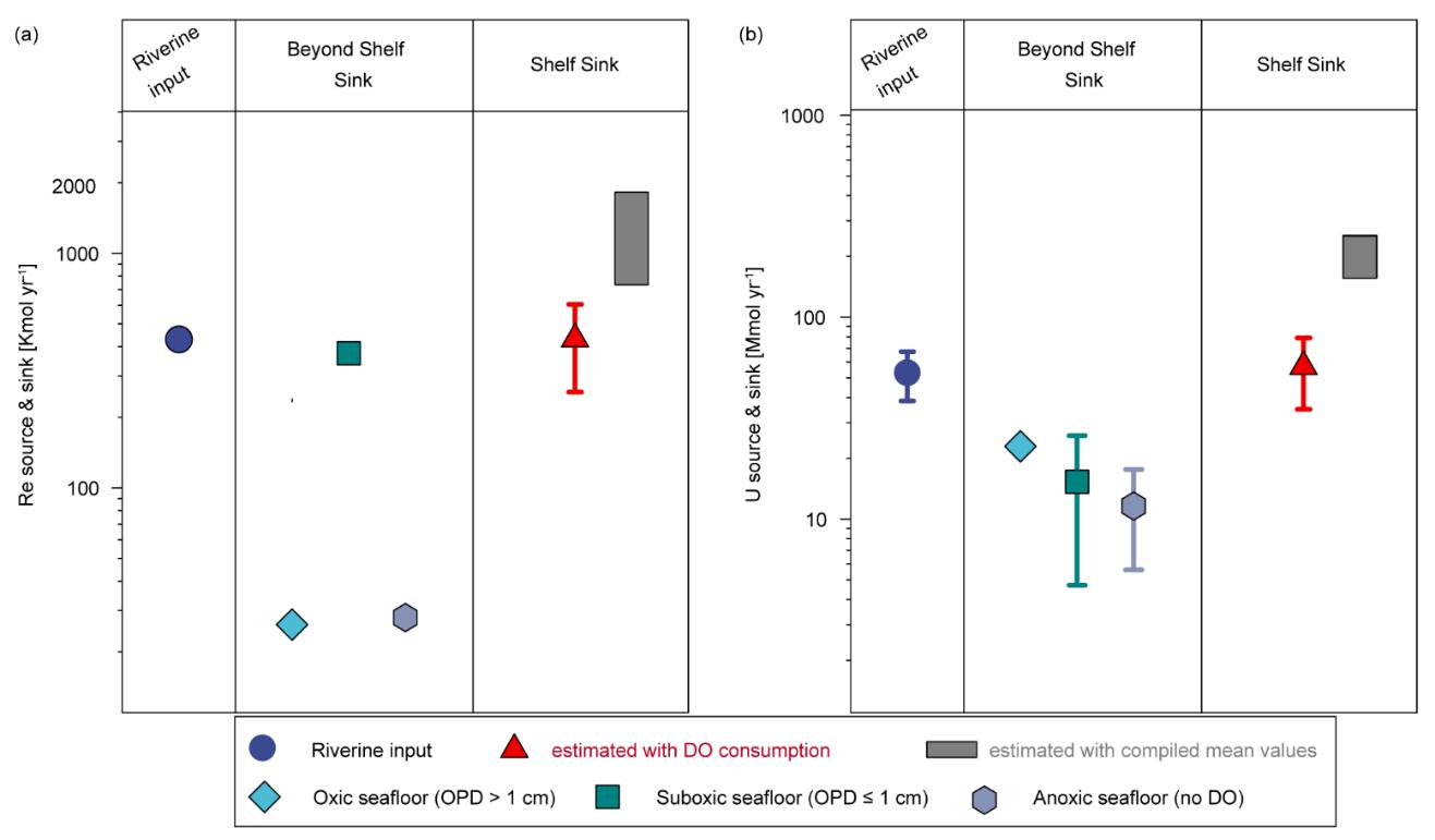 图2. 现代海洋溶解态Re和U的源汇通量比较
