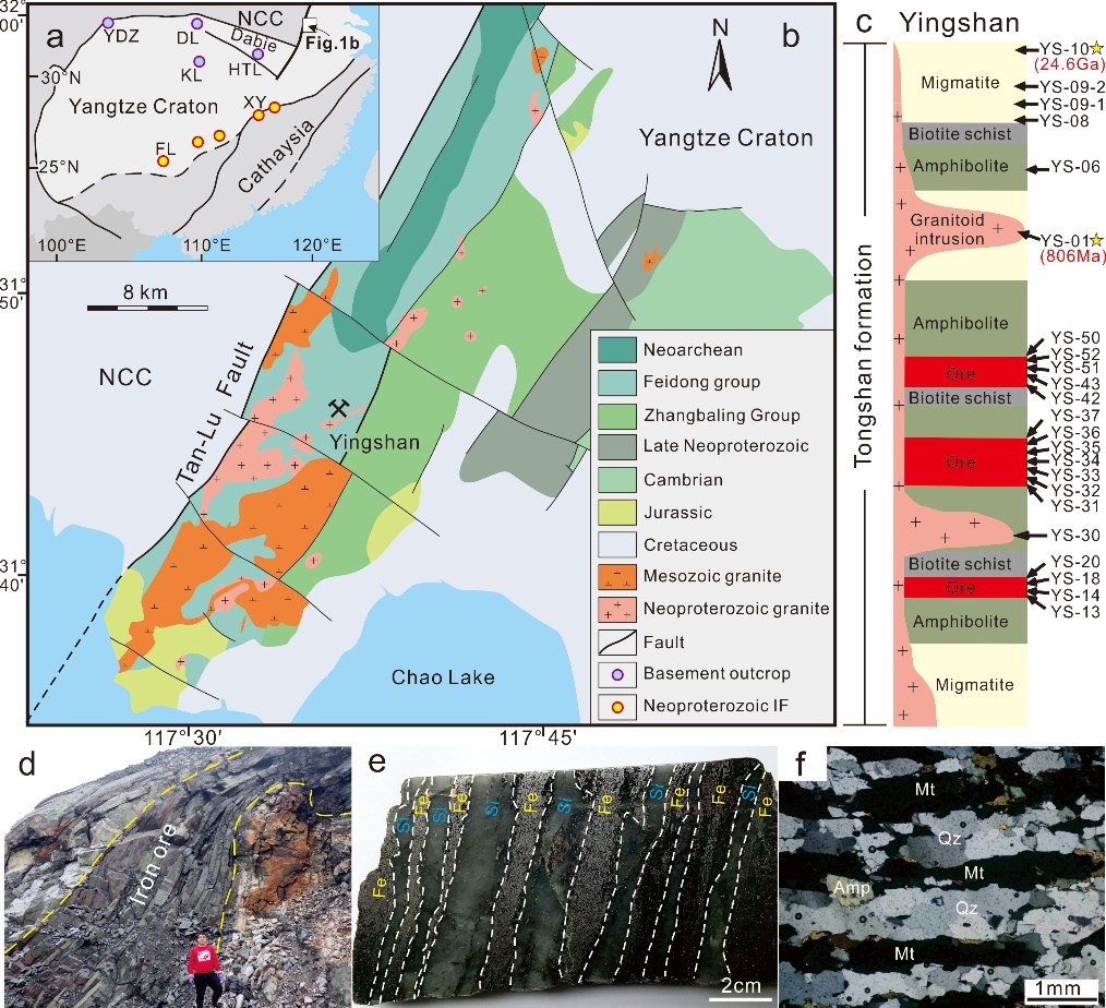 条带状铁建造(Banded Iron Formation: BIF)仅产于前寒武纪,是全球主要铁矿资源(占70%以上),其形成多与太古代-早元古代期间的全球大氧化事件(GOE)有关。我国铁矿资源紧缺,年进口铁矿石外汇仅次于原油位居第二,其中2016年铁矿石进口额就高达576亿美元,极大增加了社会经济发展的成本。中国的铁矿资源主要集中在华北,以太古代BIF为主,而华南仅发育少量新元古代铁建造(NIF),缺乏全球BIF最主要成矿期(GOE期)的铁矿。pg电子官网教师吴昌志副教授、李伟强教授和杨涛副教授课题组在详细的野外考察和岩相学工作的基础上,通过元素地球化学及铁同位素研究证实安徽巢湖英山铁矿为BIF,并通过锆石U-Pb年代学揭示该铁矿形成于晚太古代-古元古代之交(2464±24 Ma),且被新元古代花岗岩(806±5Ma)所侵入。本次研究首次证实扬子克拉通存在晚太古代-早元古代(GOE期)BIF,表明扬子板块具有与全球铁成矿峰期一致的BIFs记录,并可与Southern Sao Francisco (SF)克拉通的前寒武纪演化史相类比,暗示扬子北缘的古老基底中存在重要的BIFs资源。目前,该课题组正在继续开展对扬子北缘前寒武纪基底BIF形成过程和成矿规律的研究。