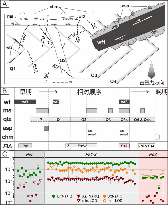 图1. 黑钨矿与共生石英形成的流体过程精细重建与主要元素差异