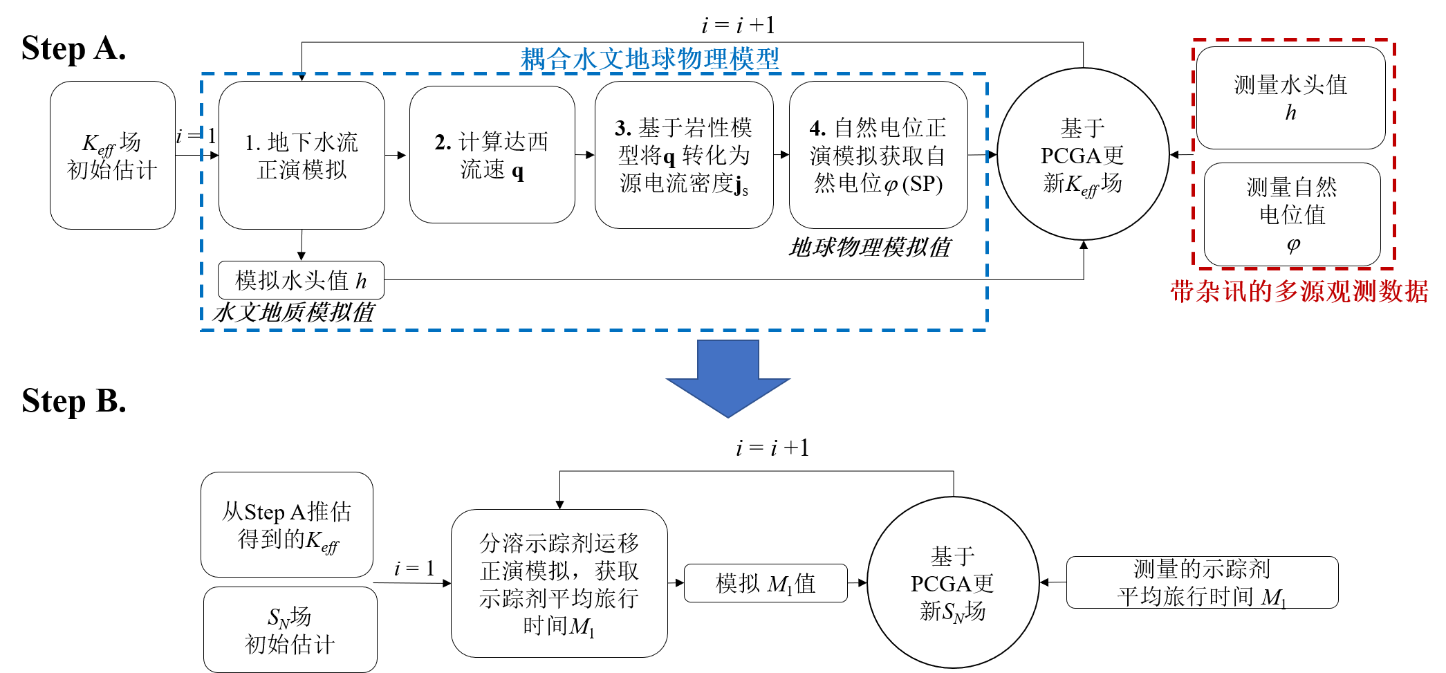 为解决上述问题,pg电子官网吴吉春教授和施小清教授课题组与美国斯坦福大学Peter K. Kitanidis教授合作,构建了一套精细刻画DNAPL污染源区结构的多源数据同化框架。该框架的先进性表现在两方面:1)融合大量廉价且低精度的水文地球物理数据(如self-potential自然电位,SP)与少量高精度的钻孔观测数据(如压力水头,示踪剂浓度),从而以较低的观测成本实现DNAPL场址的高精度刻画。自然电位法是一种无损物探方法,通过布设于地表的电极来监测地下流体造成的电性差异,基于此电性差异可间接获知地下流体的动态与含水层非均质空间结构。由于自然电位法无需布设钻孔,仅通过地表电极便可实现监测,其观测成本大大低于钻孔调查。但限于信号干扰和岩性物理关系,自然电位数据的测量精度通常较低。基于数据融合思路,本次研究联合了大量廉价-低精度的自然电位数据与少量昂贵-高精度的水力层析数据(压力水头),可以较低的成本获得高精度的渗透系数空间分布。基于此高精度渗透系数估计结果,进一步融合分溶示踪剂数据(partitioning tracer),从而实现DNAPL场址的高精度刻画。2)采用主成分地质统计反演方法(Principal Component Geostatistical Approach, PCGA),对协方差矩阵进行低秩估计,从而大大缓解了高维参数反演问题的计算负担。该多源数据同化框架的流程图参见图1。