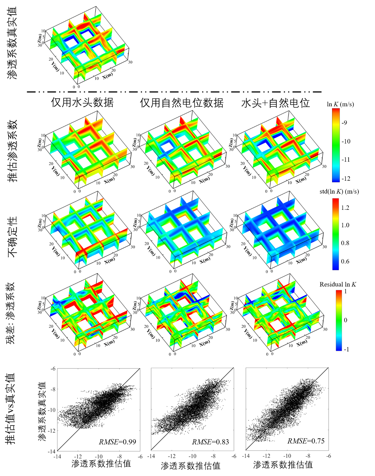 基于三维理想算例,论文对比了传统方法(仅用水头,示踪剂数据)与本研究所提出的联合水文地球物理-水文地质数据框架(水头+自然电位+示踪剂数据)的反演结果,对比结果见图2与图3。由图2和图3对含水层渗透系数非均质性和NAPL饱和度的反演识别结果对比发现,本研究可以在有限的钻孔数据下较精确地刻画渗透系数与DNAPL污染物的复杂空间分布。在本文算例中,增加自然电位观测数据可使渗透系数的推估误差降低24%,使NAPL饱和度的推估误差降低68%。