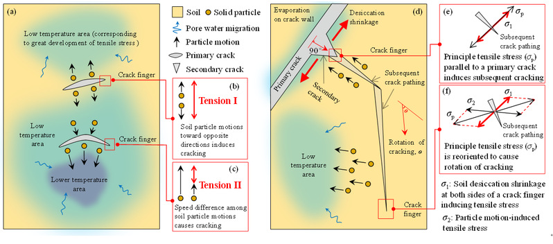土体干缩开裂机制 (Schematic for dynamic mechanisms of a primary crack and a secondary crack, in association with evaporation-related temperature distribution)