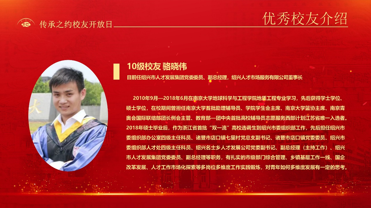 10级校友 绍兴市人才发展集团党委委员、副总经理,绍兴人才市场服务有限公司董事长 骆晓伟