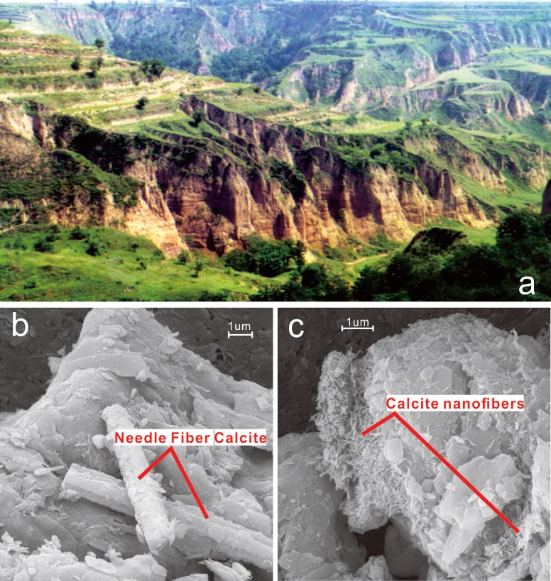 图1洛川黄土-古土壤剖面与成壤碳酸盐形态 (a) 洛川剖面更新世风尘沉积序列,可见颜色深浅交替的黄土-古土壤旋回;(b)-(c) 扫描电镜下古土壤全岩成壤碳酸盐形态