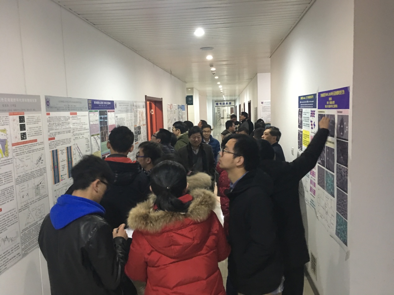 本次学术年会共分4个部分,由14个主题报告和24个海报构成。主题报告由实验室骨干科研人员精心准备,形式活泼,围绕重点实验室的主要研究方向或在发展中的前沿领域,讨论了各相关学科前沿的或关键的具体科学问题,并结合已有的研究进展或心得,做引导性发言。陆现彩教授将矿床的再循环与环境和表生过程联系起来,提出了新的思考。王国光博士通过对钦杭成矿带北东段几个晚中生代铜矿的流体包裹体进一步研究对矿床的成因机制提出了新的见解。李伟强教授对金属稳定同位素在矿床成因研究中的应用进行了详细剖析,并指出了其重要的发展前景。陈立辉教授对板内玄武岩与地壳物质再循环的前沿研究问题进行了介绍,并汇报了他们最新的重要研究成果。王勤教授对花岗岩侵位过程流体迁移对于围岩的影响进行了仔细的介绍,探讨了其对成矿作用的指示意义。吴昌志副教授介绍了东天山花岗岩的特征及稀有金属成矿潜力。张爱铖教授通过他们最新的成果对太阳星云的消散提出了新的认识。朱文斌教授介绍了他们在塔里木地块发现的3.7 Ga的TTG(奥长花岗岩-英云闪长岩-花岗闪长岩组合的简写),最新的研究成果扩大了我国前寒武纪研究的广度和深度。王孝磊教授对华南的块体形成过程进行了总结,根据新的资料对扬子地块的块体属性提出了新的见解。陈天宇教授对现代深海通风与碳循环的研究科学前沿进行了评述,并提出了自己的新认识和新进展。李娟博士对东特提斯藏南地区地层所反映的古新世-始新世极热事件做了介绍。杨涛副教授对实验室S同位素的分析情况及科学意义和研究潜力进行了介绍和评述。章荣清博士对锡石U-Pb定年的总体情况和新的进展做了点面结合的介绍。胡欢博士对新建设的LA-ICP-MS实验室新近的建设和运行情况及稀有矿物U-Pb定年的新进展做了详细汇报。每个主题报告之后都有热烈、自由、平等和充分的学术讨论与交流。与会师生也对实验室下一步发展也提出了很多宝贵的意见。