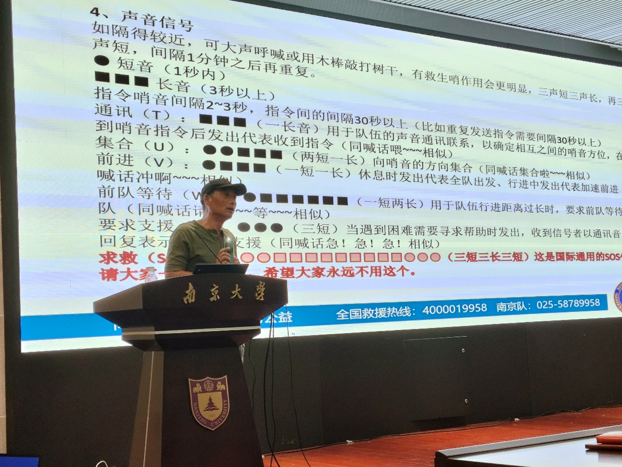 野外工作安全培训由南京蓝天救援队副队长杨兢讲授,讲授过程中杨队结合自身野外作业经验以及救援案例,亲切生动形象地传授了野外生存与求救所需要的基本技能与知识,包括野外作业的物资准备,野外求救时间与信号,野外工作中可能遭遇的危机情况等等,并科普了一些实用的野外生存常识。通过讲授,现场培训师生对野外作业的安全保障工作有了更为完整成体系的认识,也基本掌握了宝贵的野外求救技能,以备不时之需。