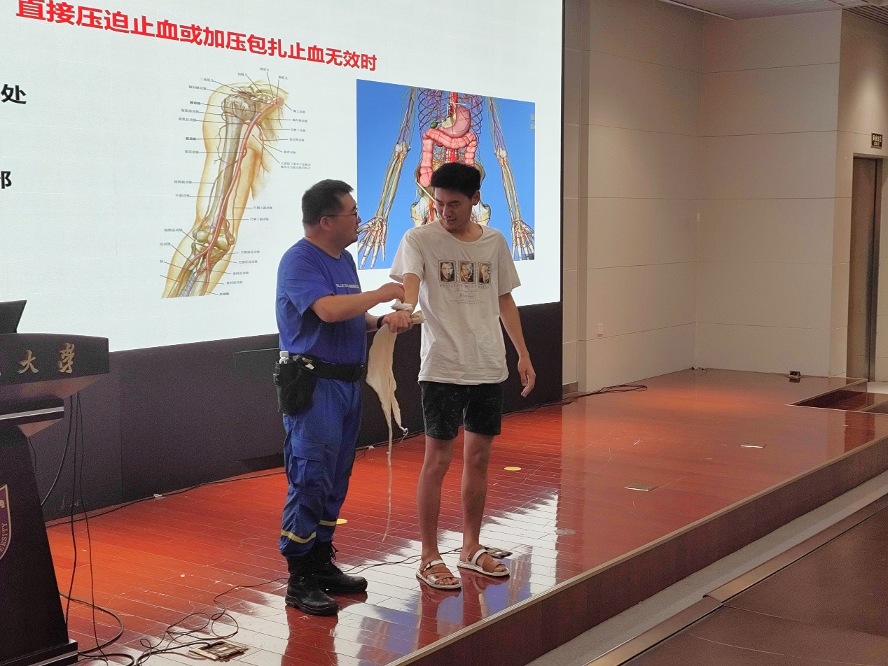 户外止血包扎固定搬运实操课程由南京蓝天救援队的队长助理杨琨老师教授,杨老师作为专业的应急救援员,利用有限的时间讲授了尽可能多的户外救援状况与方法,包括表皮毛细血管、静脉血管、动脉血管破损失血时的不同处理方式,紧急止血法和包扎方法,癫痫及溺水等情况的应急处理方法等。在向同学们展示正确的止血带止血法时,邀请了22级的朱基同学上台配合展示。在轻松愉快的互动过程中,同学们掌握了专业实用的户外急救技巧。