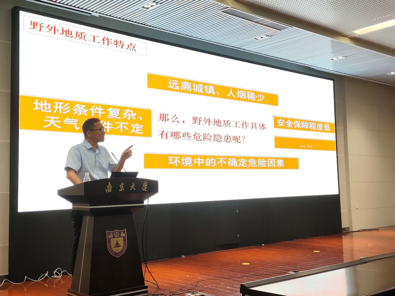 最后的地质学专业学生野外安全注意事项由地科院普地认识实习的带队副队长王国光老师讲授。作为经验丰富的地质工作者,他将野外技能安全培训相关知识与自己的地质考察实际经验结合起来,强调了野外实习过程中的纪律规矩意识,包括听从统一指挥、关注个人身体状况、切莫逞强、团队协作等方面,对即将奔赴野外考察、实习实践的学生起到了重要的指导作用。