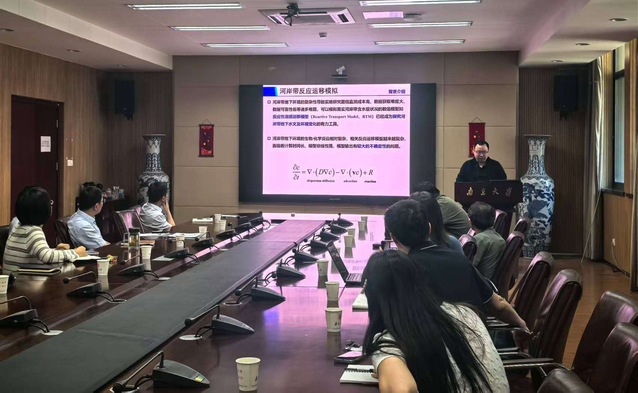 戴恒教授首先分享了其在河岸含水层中氧化还原过程的主控因子识别与生物地球化学模拟方法的创新进展。在第一部分,戴恒教授介绍了其围绕溶解氧与活性氧的生成机制构建了典型河岸带的二维反应迁移模型,结合深度学习替代模型与全局敏感性分析方法识别了水文条件、渗透性与微生物呼吸等关键控制因素。在第二部分,戴恒教授聚焦微生物介导的氮循环与污染物降解过程,提出了融合宏基因组信息与动态流平衡分析的方法,建立了基因中心反应迁移模型,并通过多种实验验证了其在描述复杂生物地球化学过程及污染场地修复中的可行性。