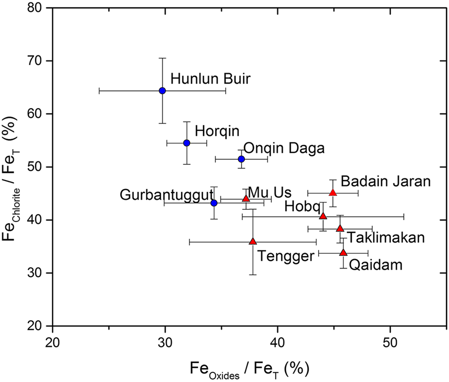 图1中国沙漠表层沉积物粘粒中铁矿物与铁形态分布特征