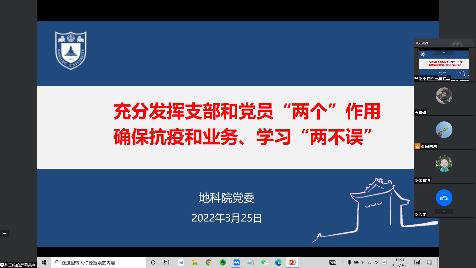 最后王唯书记作总结,他指出大家的发言有分析、有要求、有目标,希望党委和支部充分发挥政治功能,起到引领和监督作用。一要树立全局观。只有了解全局的工作,才能知道自己的工作在全局当中的地位和作用,才能更好的做好自己的工作。他要求教职工和学生都要为建设“第一个南大”而努力奋斗;二要用新发展理念来指导工作。用创新进行形式、内容的提升;用协调推进教工支部将党建和教学科研、人才培养、社会贡献结合,学生支部将党建和完成学业、就业工作相结合;用共享开展支部共建共联,共享资源、智慧;三要坚信我们一定能够战胜疫情。要严格遵守疫情防控规定,在疫情防控中起模范作用;四要重点关注毕业班的学业问题。学生支部要主动了解学生学业情况并引导、动员学生加强和导师联系,导师要主动关心学生,减轻应疫情带来的心理压力和负面情绪;五要强调安全稳定和意识形态工作。要筑牢政治安全、意识形态安全、心理健康安全的底线思维,支部和党员要发挥战斗堡垒和先锋模范作用,带动和引导周边同事和同学,共同守住底线和防线。建设“第一个南大”是我们的责任和使命,也是上级党组织的嘱托和要求,我们地科院党委和全体地科人一定不负重托,努力践行,以实际行动和出彩的业绩迎接党的二十大的胜利召开。