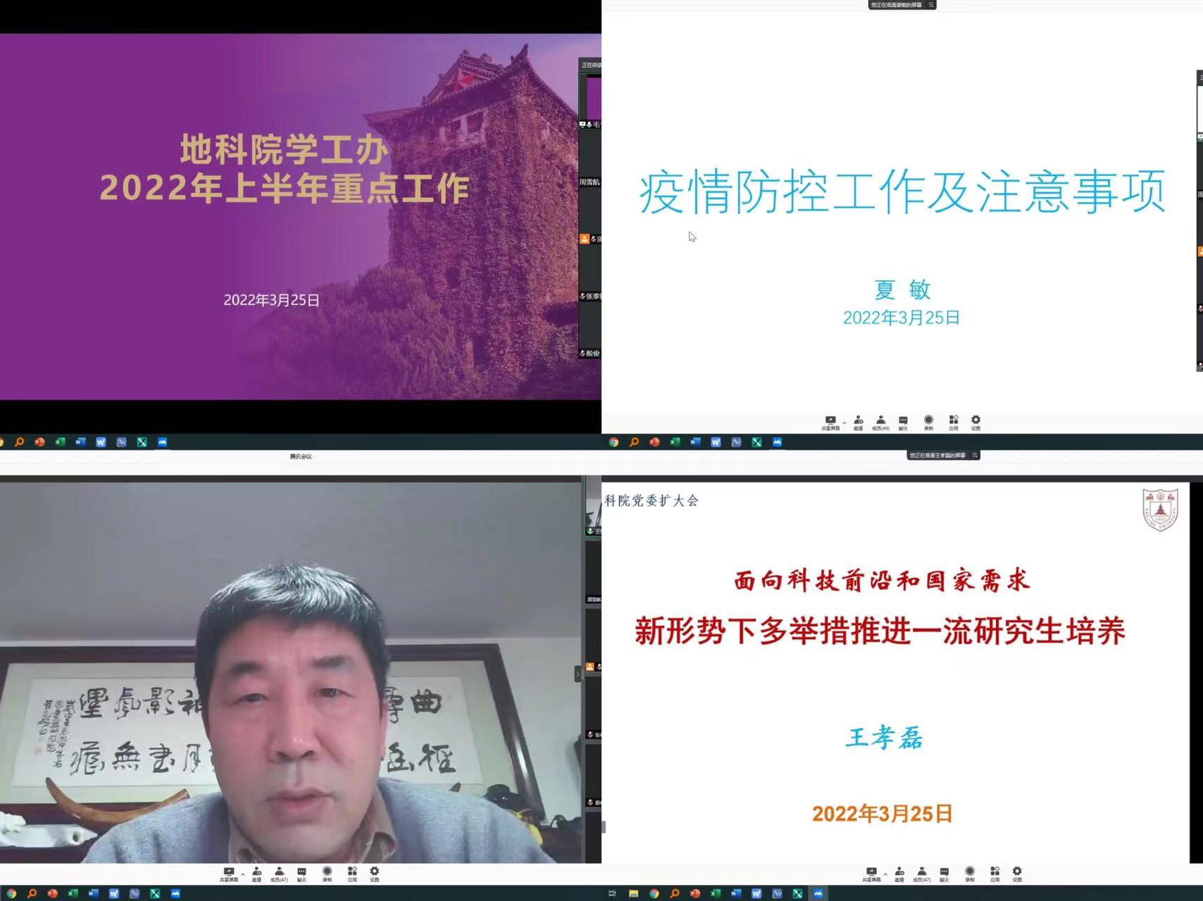 为充分发挥支部和党员的“两个作用”,确保抗疫和业务、学习“两不误”,3月25日,地科院党委在线召开院党委扩大会暨新学期工作会,院党委委员、教工和学生支部的全体支委参加会议。会议由党委书记王唯主持,党委副书记毛予倩、副院长夏敏、王宝军、王孝磊分别就学生工作、疫情防控工作、本科教学及研究生培养工作发言。