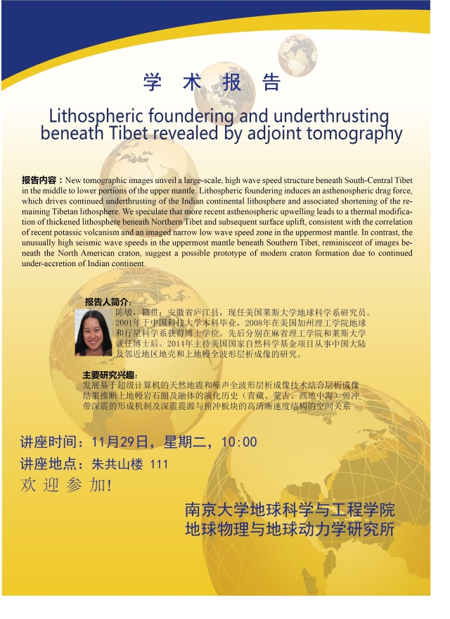 主题:Lithospheric foundering and underthrusting beneath Tibet revealed by adjoint tomography