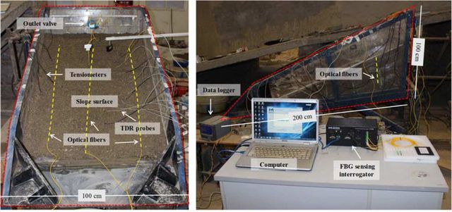 摘要:In order to explore the initiation of landslide-debris flow caused by concentrated runoff, a flume test has been performed on soil samples taken from a debris flow site in Wenchuan earthquake area. The fiber Bragg grating (FBG) technology was used to measure the strain distribution information in the slope mass during erosion. Several hydrological sensors for monitoring pore water pressure and soil moisture were used to investigate their correlation with internal strain field. The test results show that the fiber optic sensing technique exhibited high sensitivity and precision in monitoring the slope deformation. The development of pore water pressures and soil moistures showed reasonable consistency with the dynamics of an infiltration. According to the strain measurements, there were four evolution stages during the initiation of landslide-debris induced by runoff, i.e., the water absorption stage, the deformation stage, the shear zone formation stage, and the fluidization stage. The results provide an improved insight into the mechanism of debris flow initiation and indicate the enormous potential of the FBG sensing technology in establishing an effective early warning system for landslides and debris flows.