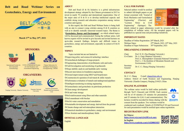 “Belt and Road Webinar Series on Geotechnics, Energy and Environment”(“一带一路”岩土、能源和环境在线研讨会)将于2021年3月27日至5月29日在线召开,欢迎注册参会!