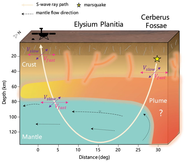 图3 洞察者号下方火星内部结构模型,用于解释火星地震记录中的直达 S 波分裂现象。该模型包含了埃律西昂平原(Elysium Planitia)下方的潜在地幔柱。实心箭头线表示从火星地震(黄色五角星)到洞察者号的直达 S 波的射线路径。交叉的双向箭头(粉红色表示快横波和紫色表示慢横波)标记了火星地震各向异性的可能区域,其中源自洞察者号下方更深的地壳(> 10 公里)可能是由于定向排列的裂缝引起的,另一种可能则是源自埃律西昂平原下方的地幔流引起的。