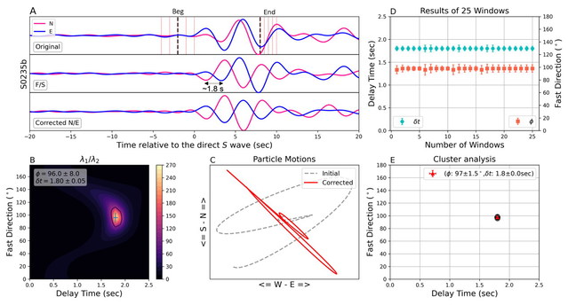 石静博士利用洞察者号地震仪探测到的低频火星地震数据,通过系统的理论计算分析,首次揭示了火星地震记录中的剪切波分裂现象。在三个高信噪比的火星地震记录(S0173aS0235b S1133c)中观察到直达S波的分裂现象(见图2)。通过合成测试排除了视各向异性的可能性,确认了火星存在地震各向异性。进一步分析表明,直达S波分裂测量到的延迟时间差较大,不能仅归因于洞察者号下方上地壳(0 – 10 公里)内的地震各向异性,指示火星更深区域也具有地震各向异性。结合洞察者号着陆点附近的其他地球物理证据,石静博士的研究结果表明,洞察号下方地壳中定向排列的裂缝可能大于10公里,和/或火星埃律西昂平原下方存在地幔流。