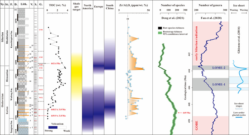 有没有一种可广泛对比的指标,用来识别火山物质的输入,进而指示火山作用?不活动微量元素可以记录火山物质信息(Zr与Hf),并且不易受沉积与成岩作用的影响,而成岩改造中脱玻化与伊利石化会显著改变火山物质的主量元素组分特征(丢失Si、富集K),这些元素地球化学特征为沉积岩中火山物质的判识提供了一种新思路。为此,pg电子官方网站杨生超博士、胡文瑄教授、樊隽轩教授与南京地质古生物研究所邓怡颖博士合作开展研究,收集整理已发表的奥陶—志留之交火山灰全岩地球化学数据,通过分析火山物质与页岩在物质组成、成岩改造与元素地球化学特征方面的差异,建立了一套基于全岩元素地球化学特征的火山物质输入判别标准。研究发现Zr、Hf、Zr/Cr、Zr/Al2O3、Cr/Al2O3、V/Al2O3、Ni/Al2O3、SiO2/Al2O3与K2O/Rb等指标及其组合,可以有效从泥页岩中识别火山物质。虽然其他沉积因素(岩性、沉积速率、粒度等)可能会对这些指标造成影响,但多个指标的共同约束,可以有效恢复火山活动特征。地球化学指标与火山灰产状共同指示了奥陶—志留之交下扬子地区的火山活动具有两阶段特征。其中,凯迪阶中晚期持续的火山活动(第一阶段)与华南以及全球的生物多样性逐步降低吻合较好,赫南特阶末期的火山活动(第二阶段)与奥陶纪生物大灭绝的第二幕匹配较好,进一步证实火山作用在奥陶纪生物大灭绝中发挥了重要作用。此外,奥陶—志留之交华南地区持久的火山活动可能是优质烃源岩形成的重要因素。