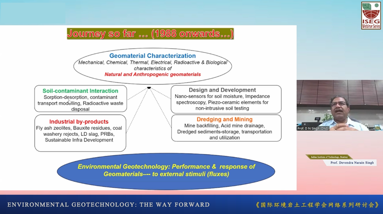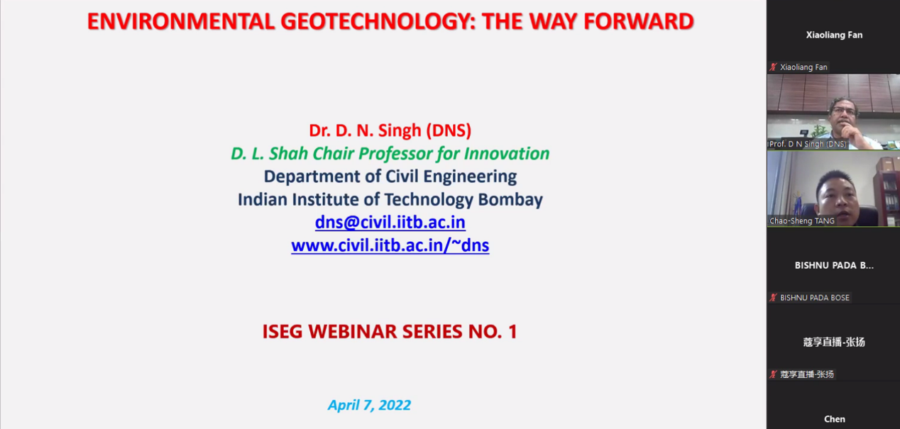 2022年4月7日,由pg电子官网承办的国际环境岩土工程学会(ISEG)网络系列研讨会顺利启动。研讨会首期嘉宾为印度国家工程院院士、Environmental Geotechnics期刊主编D.N. Singh教授。ISEG主席pg电子官网施斌教授、ISEG秘书长pg电子官网唐朝生教授、ISEG副主席、理事等国内外近400人参加了此次会议。
