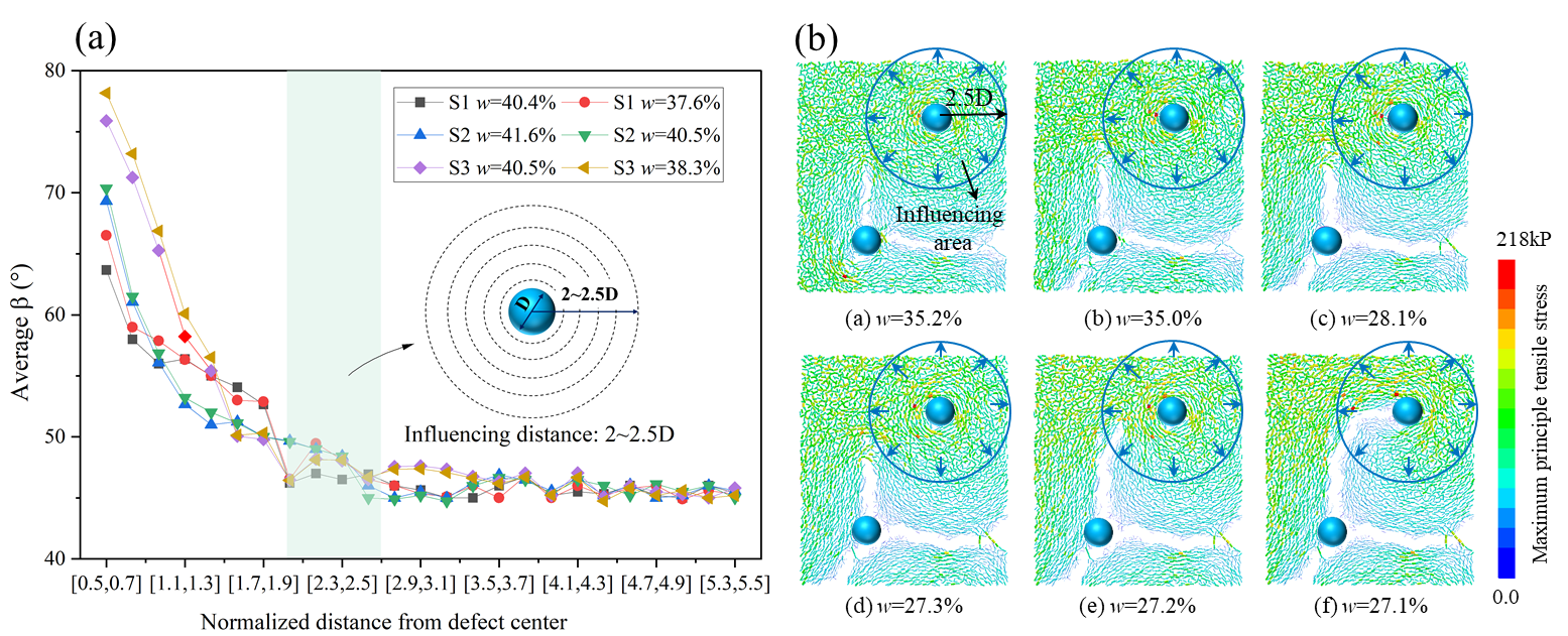 针对这一科学难题,pg电子官网唐朝生教授课题组创新地采用离散单元法(DEM)构建了耦合土体干缩变形与表面蒸发的数值模型(图2),通过系统模拟含不同尺寸、空间分布及数量配比表面瑕疵的土样干燥过程,定量揭示了表面瑕疵在干缩裂隙形成与发展过程中的关键作用。研究发现,瑕疵点在其周围约2.5倍直径范围内可引发显著的主拉应力集中,进而形成弧形微裂隙,并最终演化为典型的“Y”型裂隙(图3)。一旦已有裂隙进入该影响区,裂隙路径将发生偏转并逐步向瑕疵点汇聚,表现出明显的“裂隙吸引”效应(图4)。此外,表面瑕疵还会打破均质土体中裂隙的级序发育规律,导致裂隙网络呈现出正交与非正交形态共存的特征。该成果首次定量揭示了表面瑕疵结构对土体应力场与开裂模式的主控作用机制,阐明了结构非均质性如何改变裂隙形态与演化路径。这一认识不仅拓展了土体龟裂的理论基础,也为边坡工程、填埋场覆盖层等涉裂结构设计提供了重要科学支撑。