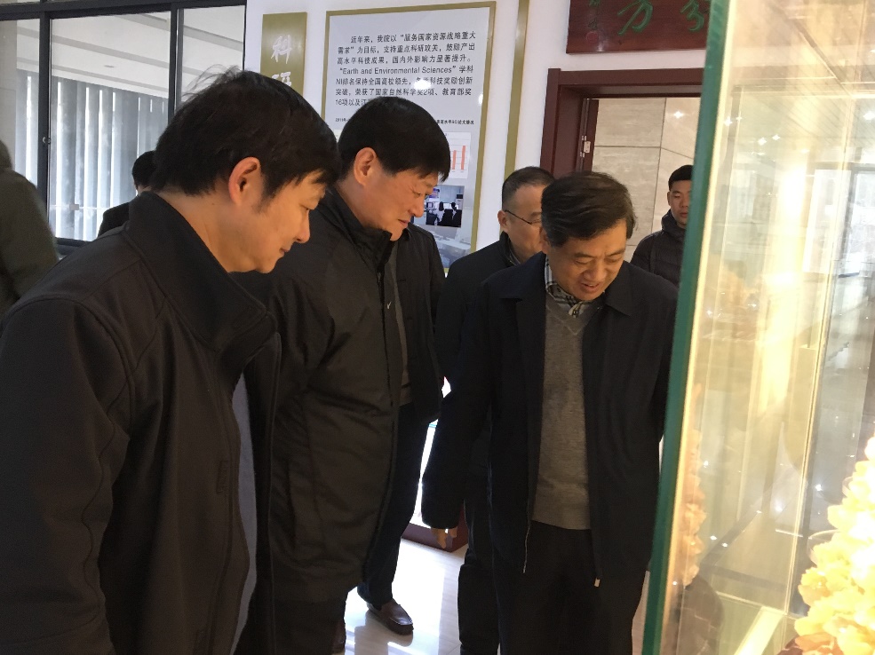 胡金波首先考察了内生金属矿床成矿机制研究国家重点实验室和表生地球化学教育部重点实验室,了解相关科研工作进展情况,接着参观了pg电子官网院士、校友风采展。
