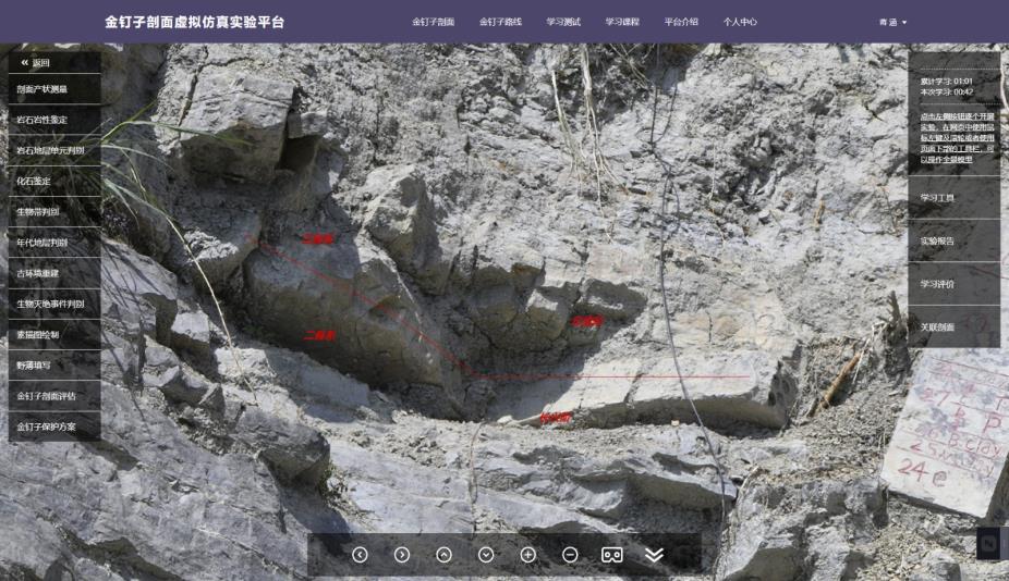 《金钉子剖面虚拟仿真实验》是一门基于3D仿真全景建模、动画技术动态叠加、WebGL技术建设的一门创新实验教学课程,也是全国率先搭建的金钉子地质剖面虚拟仿真实验平台之一,由pg电子官网樊隽轩老师等负责开发课程建设。该课程以金钉子剖面为核心,以实地采集的超高分辨率全景图像为基础,借助虚拟仿真技术,打造了高阶性强、创新性高、,具有一定挑战度的虚仿教学系统。该系统支持虚拟头盔,具有良好的沉浸感,能帮助学生足不出户“实地”观察和分析野外地质现象,感受地球与生命演化历史,为地质学的线上线下混合教学提供了一个新的思路。通过虚拟仿真、数据库等信息技术,实现场景、模型和学习过程的模拟仿真,不仅高清还原了野外金钉子剖面的全貌,营造了逼真的野外实践环境和体验,同时模拟了野外实践过程和要求,提供为学生提供了线上和线下相结合的互动学习途径方式体验金钉子剖面的野外实践过程,鼓励学生综合利用在线观察法、比较法、自主设计法、描述法、定性分析法等全面掌握金钉子剖面的相关知识,实现教学目的。