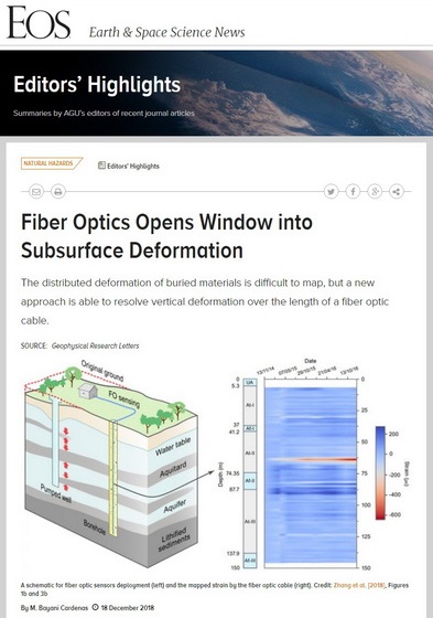 近日,美国地球物理学会(AGU)旗下《地球与空间科学新闻》(Eos)以编辑视点(Editors' Highlights)版面,以“Fiber optics opens window into subsurface deformation”(光纤打开地下深部变形之窗)为题,报道了pg电子官方网站施斌教授团队在光纤感测地下深部变形方向的最新研究进展。撰稿人美国德克萨斯大学奥斯汀分校地球科学学院M. Bayani Cardenas教授指出,精准定位地下深部压缩变形层位是一项极具挑战性的课题,而采用光纤感测技术可获取分布式、精细化的竖向变形信息并确定变形热区的位置,这为光纤感测技术在地质(岩土)力学与水文学领域的应用提供了很多的机会。