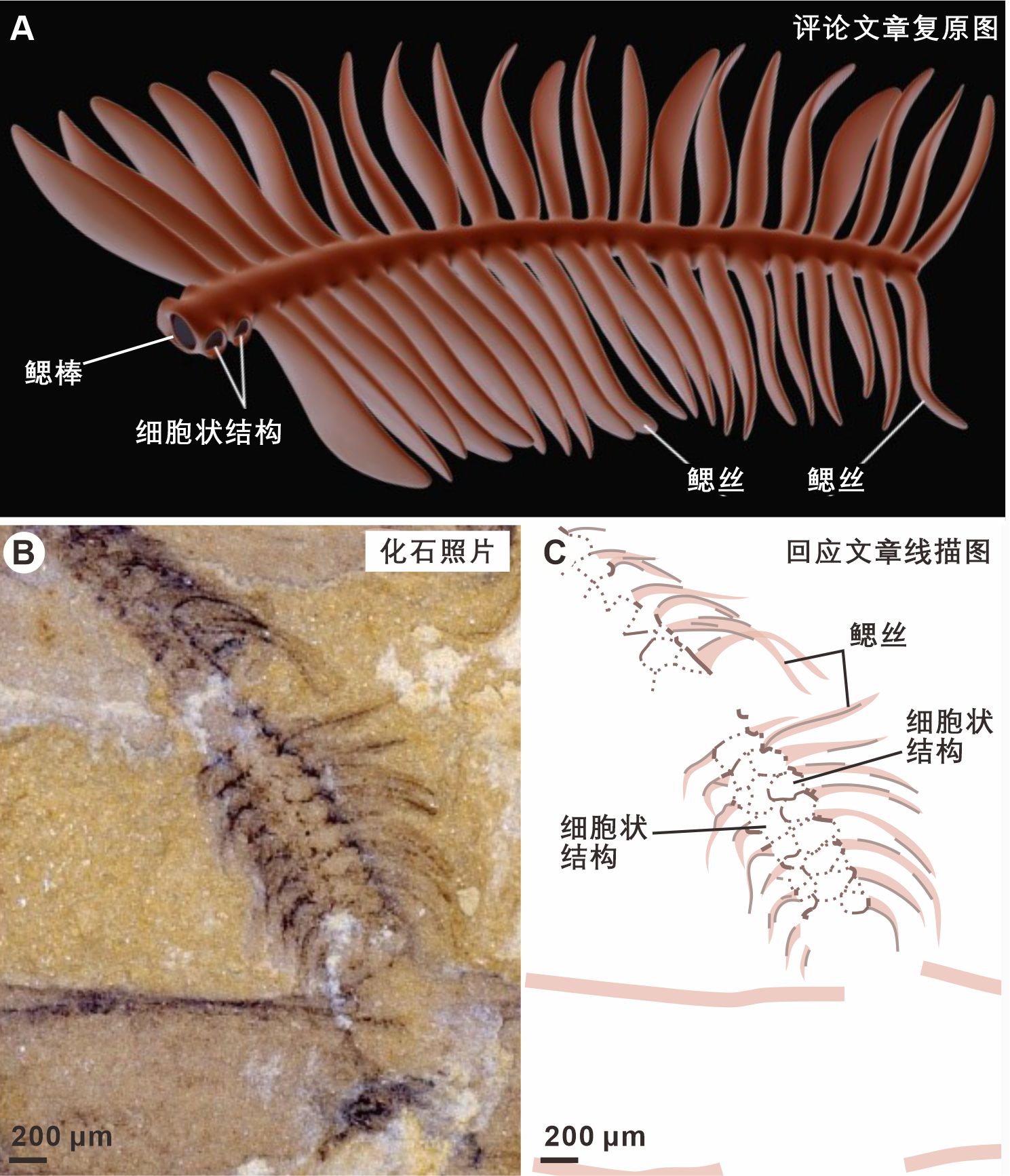 He等认为鳃棒是中空的管状结构,鳃棒的细胞状结构是中空的鳃丝根部形态(图1A)。但是,He等评述文章中展示的化石照片(图1B)显示鳃棒并非中空,含有紧密堆叠的细胞状结构。这些细胞状结构与鳃丝并没有一一对应(图1C)。原作者团队的显微CT扫描数据从多个角度揭示鳃棒不是中空的,而是由多排2–3个细胞状结构组成。这些细胞状结构呈密闭的空心球状,与鳃棒两侧的鳃丝并不相通,排除了是鳃丝根部形态的可能(图2)。
