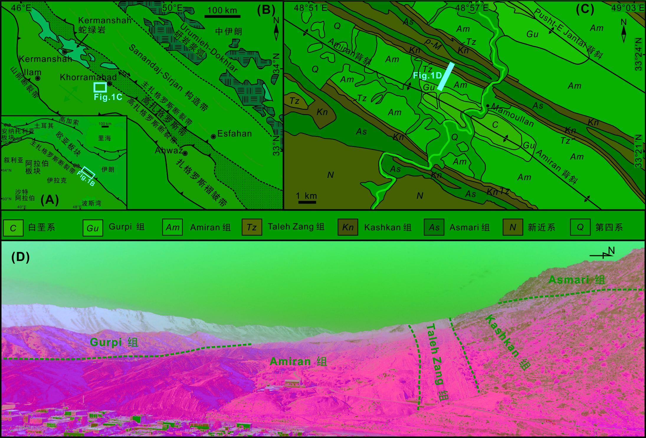 图1 扎格罗斯地区简化地质构造分带图,以及本研究区地质图及野外剖面