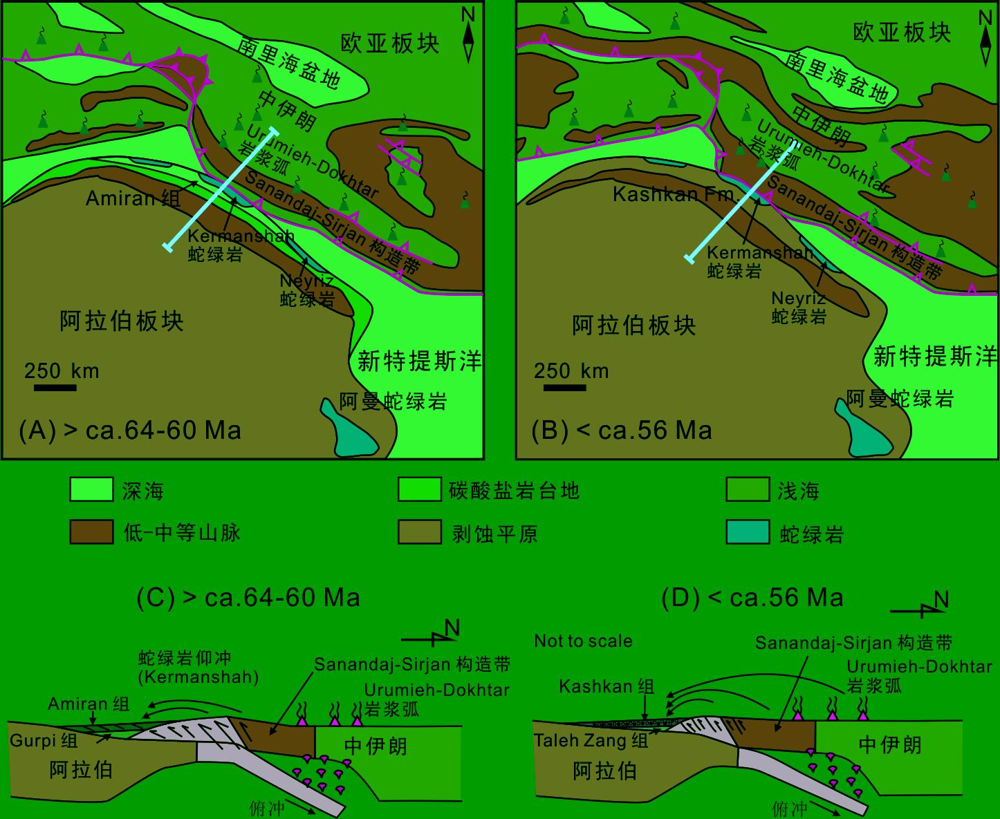 针对这一问题,胡修棉课题组以伊朗南部扎格罗斯南缘的Amiran盆地(图1)为研究对象。该盆地侏罗纪-白垩纪时期位于阿拉伯板块的南缘,保存了连续的白垩系-始新统沉积地层,记录了蛇绿岩仰冲到大陆碰撞的连续过程。作者详细研究了Amiran盆地有孔虫、钙质超微等古生物,精确建立了生物年代地层格架(图2)。地质学研究表明,该地区古新统Amiran组碎屑物质主要来自仰冲的蛇绿岩和紧邻盆地北侧的Sanandaj-Sirjan构造带,而始新统Kashkan组砂岩除出现与Amiran组相似物源外,还出现一组二叠-三叠纪(250-200 Ma)碎屑锆石年龄,并具有非常低的εHf(t)值(–19 ~ –7),认为其来自北侧的中伊朗地块(图2)。以上证据表明,在Kashkan组沉积时期,北侧中伊朗地块的物质被剥蚀、搬运到阿拉伯板块之上。由此推论,阿拉伯-欧亚板的初始碰撞至少在始新世之前已经发生。本研究还发现,从Amiran组到Kashkan组的连续演化,反映了白垩纪末-古新世发生的特提斯洋蛇绿岩的仰冲,触发了随后的阿拉伯-欧亚板块初始碰撞(图3)。