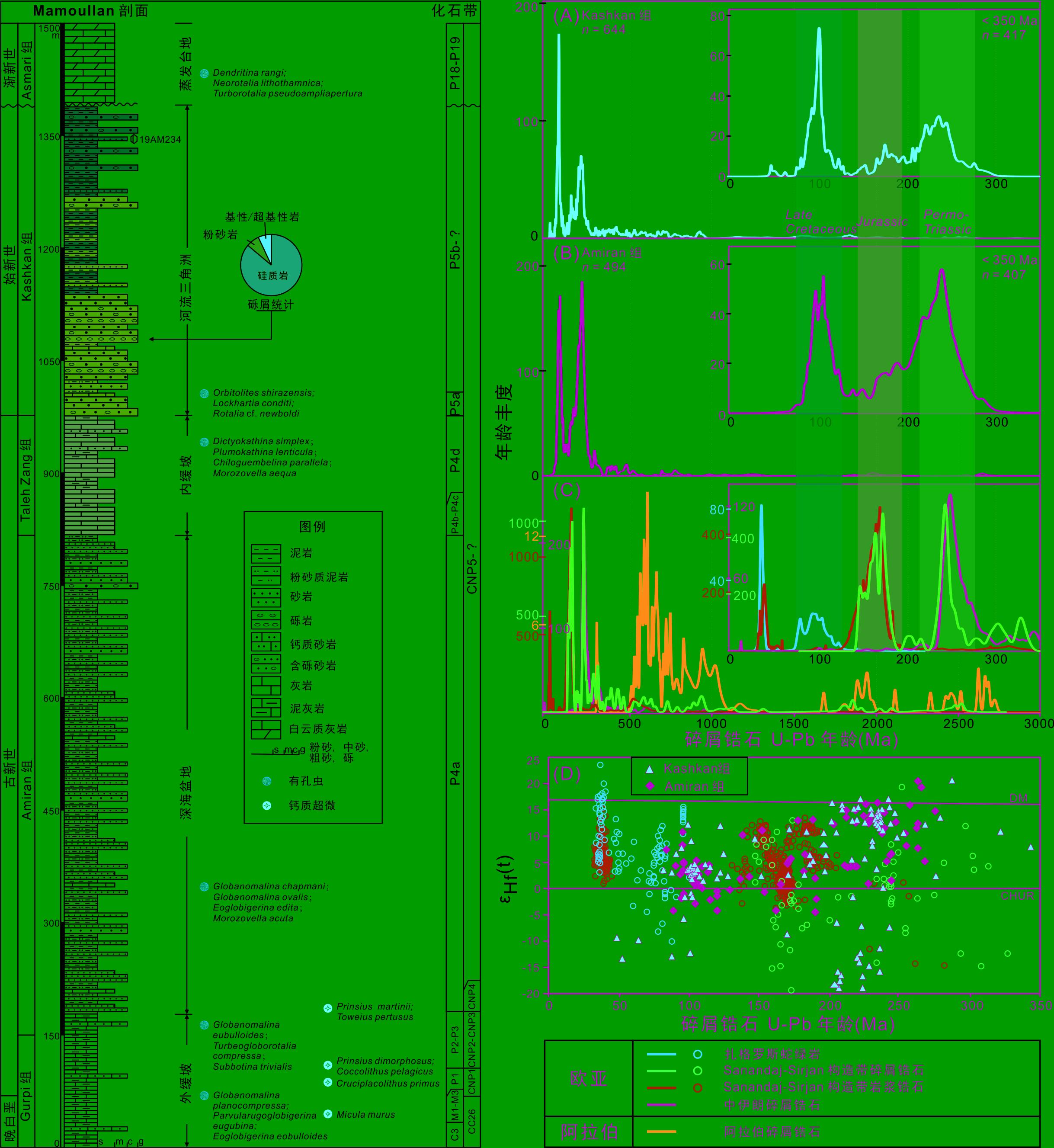 图2 伊朗Amiran盆地生物地层学(有孔虫和钙质超微化石)与碎屑物源分析