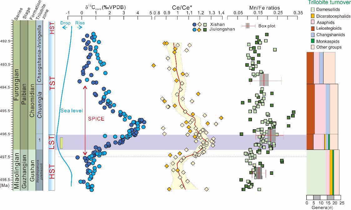 然而,SPICE事件期间海水缺氧和生物灭绝之间的直接因果联系一直缺乏定量化石多样性证据的支持,尤其缺乏来自同一沉积盆地内高分辨率化石多样性数据和区域性氧化还原方面的证据。因此,精细刻画SPICE事件在不同区域发生过程,对揭示其与同期三叶虫动物灭绝事件之间因果关系及其全球普遍性规律有重要意义。