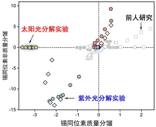 论文据此提出,锡的磁性同位素非质量分馏信号可作为光化学“指纹”,有应用于追溯大氧化(GOE)事件前后大气环境转变的潜力。在太古代低氧环境中,短波长紫外线可穿透大气层,使水体和大气中的有机锡产生非质量同位素分馏;而大氧化事件后,臭氧层的形成屏蔽了短波长紫外线辐射,导致非质量分馏信号消失。因此该研究为示踪早期地球环境演变提供了新的思路。
