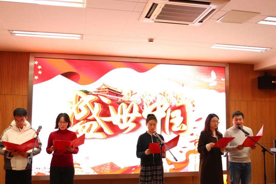 博士生一支部的五名地球化学专业的同学,学习中孜孜不倦,科研上力争上游,奋勇争先。他们作为新时代的进步青年,为祖国献上一首赞歌。接下来是由他们带来的朗诵:“盛世中国”。