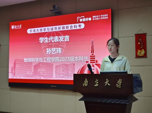 在发言环节,科考项目负责人谭道远老师介绍了项目整体目标与主要内容。他表示,此次联合科考聚焦香港独特的地质环境及城市化进程中的现实挑战,重点围绕海岸地貌演变、滑坡泥石流防治、恐龙化石发掘等专题,组织开展野外考察、城市环境调研及系列讲座。科考期间,项目将邀请香港大学、香港理工大学、岭南大学等多所高校的知名教授联合指导,促进苏港两地学术交流,提升同学们的跨学科能力和国际视野。同时,他特别强调了野外安全和团队纪律,寄语同学们“平安出访,满载而归”。pg电子官方网站2023级本科生孙艺玮代表全体队员郑重承诺,将以严谨务实的态度投身科考实践,深入探索香港环境与社会发展问题,在跨学科协作中锤炼解决复杂问题的能力,不负学校重托。