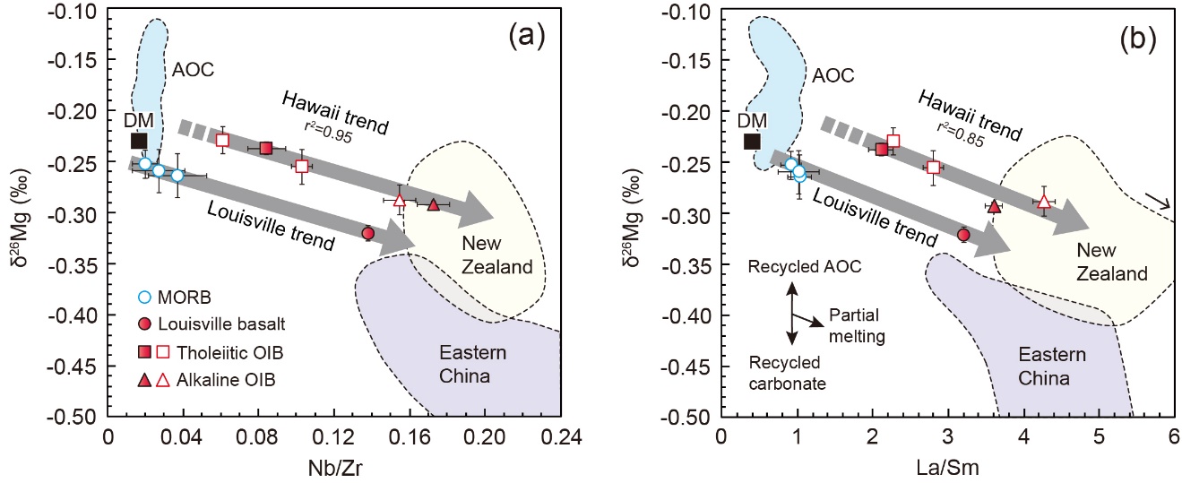 全球OIB具有高度不均一的地球化学组成,比如其放射性成因同位素组成87Sr/86Sr、143Nd/144Nd、206Pb/204Pb等比值的变化非常大,反映地幔的化学组成具有高度的不均一性。镁是地幔的主要组成元素之一,自然界中具有24Mg、25Mg、26Mg三个稳定同位素,OIB的镁同位素组成能否反映地幔的化学不均一性呢?近年来由于稳定同位素分析技术的快速发展,使这种探索成为可能。已有的研究结果认为,OIB的镁同位素组成在测量误差范围内与地幔橄榄岩(橄榄岩是浅部地幔的主要岩石类型)几乎一致,因此认为地幔的镁同位素组成是均一的,无法反映地幔的化学不均一性。目前基于放射性成因同位素体系建立的地幔地球化学理论认为,OIB的地幔源区含有大量的再循环地壳物质(通过板块俯冲到地幔深部的洋壳和沉积物)。由于稳定同位素组成在低温条件下易被改造,而重循环物质多长期暴露于地表低温环境,那么OIB应该具有和地幔橄榄岩不一样的镁同位素组成。这样,实际观察的OIB镁同位素组成与理论预测值存在显著矛盾,为此,pg电子官网陈立辉教授领导的课题组决定对全球OIB的镁同位素体系进行更深入的观察、验证和解读。