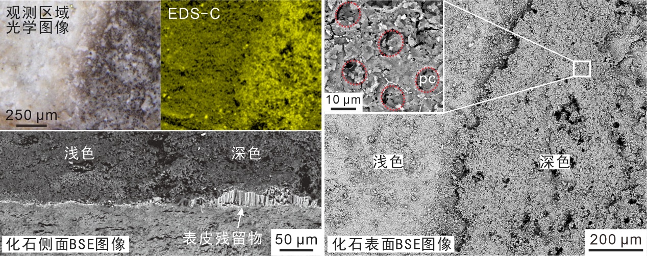 利用场发射扫描电镜等技术手段,发现化石色斑的深浅区域之间存在显著的保存差异。在化石标本的深色区域保存了一层厚度约为20-30微米的表皮残留物,并且保留有孔道(pore canals)等超微表皮结构,而浅色区域并未发现任何表皮残留物,EDS结果也显示深色区域的有机质含量更高。