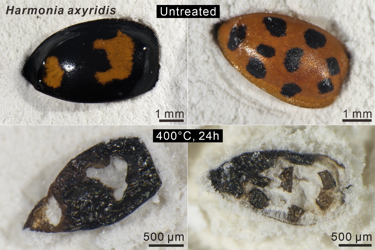 图3. 高温处理后昆虫表皮出现的单色调图案,以Harmonia axyridis为例。图中上排为实验前的样品,下排为对应样品高温处理后。