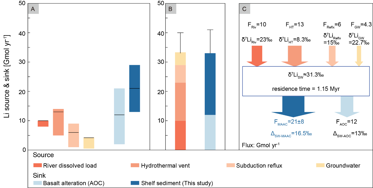 “锂”作为最轻的关键金属,广泛应用于电池、航空航天、原子能等领域。在自然界,海水的锂同位素(δ7LiSW)是反演地质历史上大陆风化和海底反风化的重要指标。准确理解现代海洋Li的源汇通量和格局对理解历史上δ7LiSW的演化具有重要的科学价值。